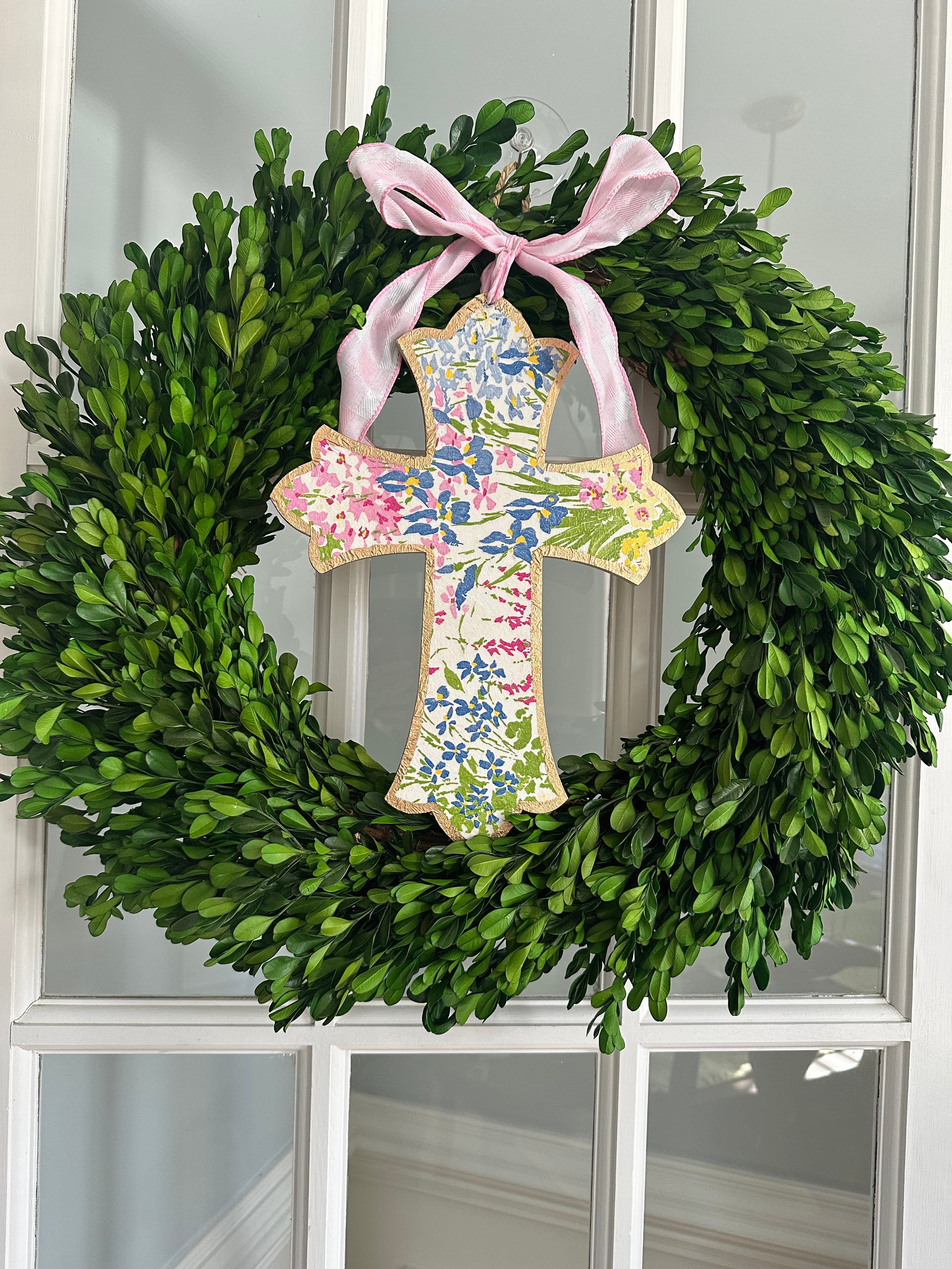 This hand decoupaged and painted 12” cross is made from wood and is perfect to add to doors by itself or as an addition to wreaths for home decor.
