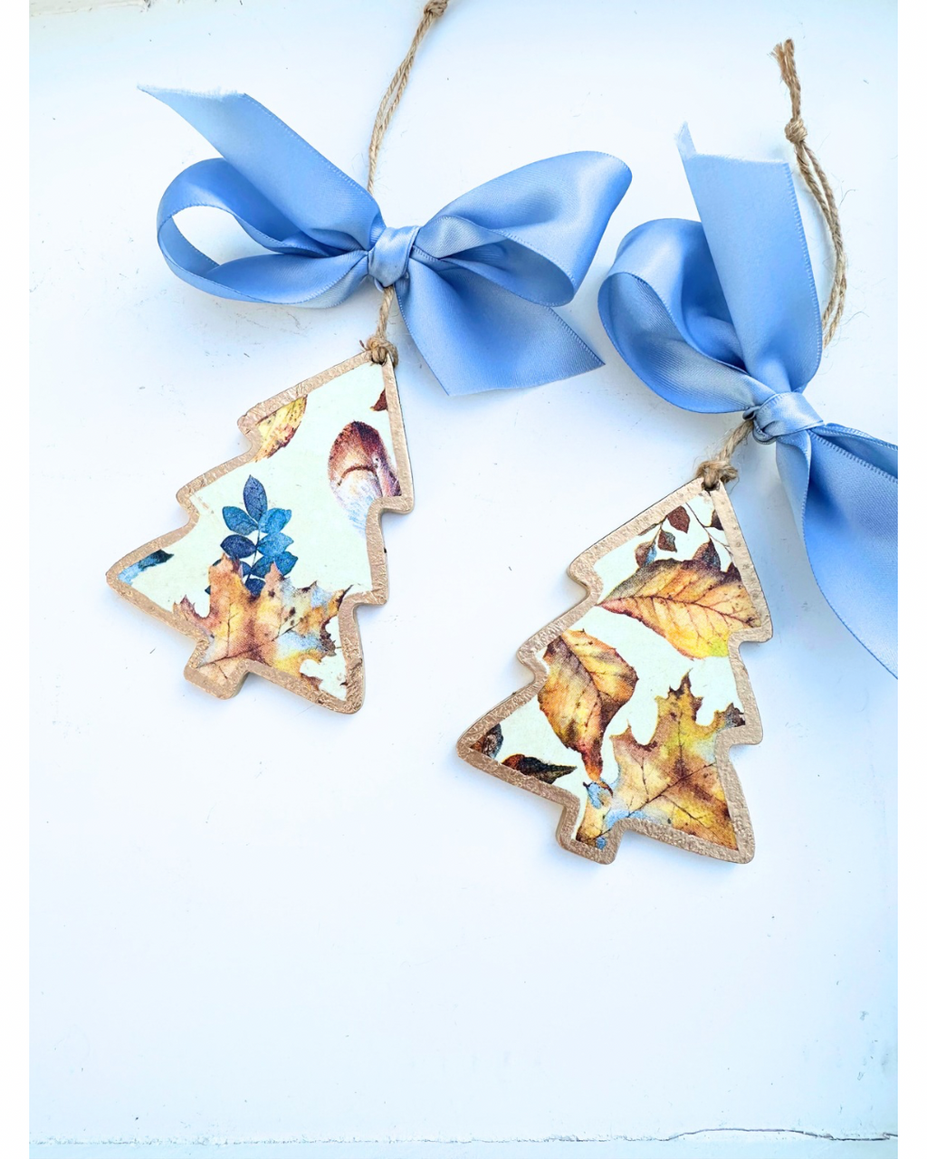 These handmade ornaments are meticulously hand decoupaged and painted and finished with a satin bow.